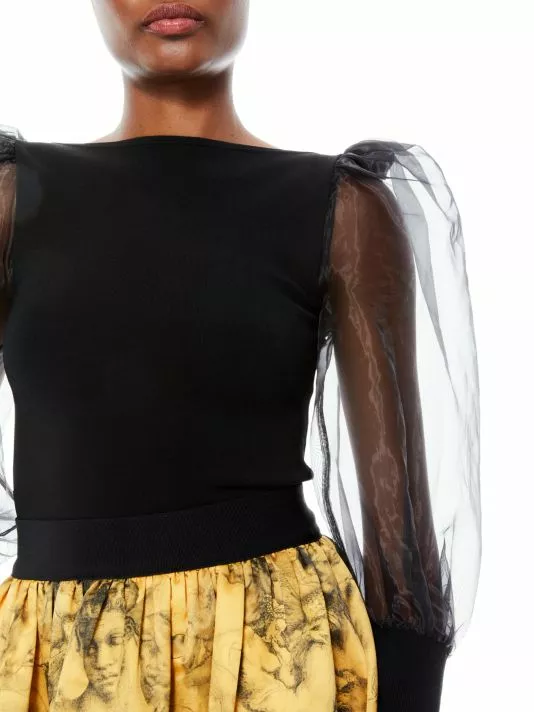 Exuding dramatic flair, this blouse flaunts structural tulle puff sleeves.