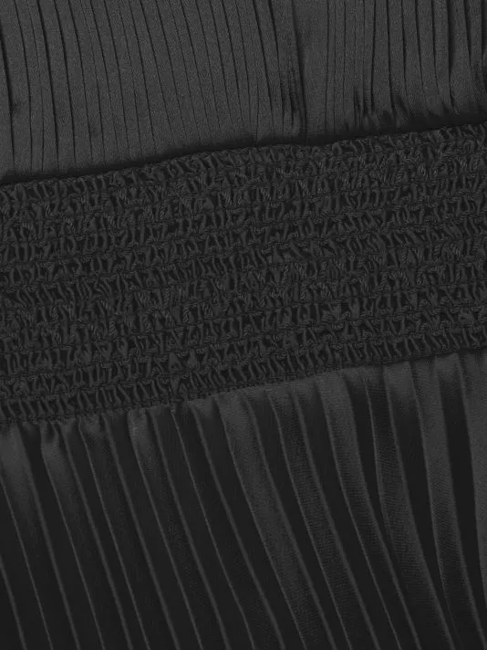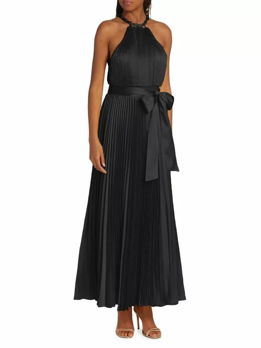 Alice + Olivia’s Alycia maxi dress is crafted of shiny pleated satin. This halterneck style is adorned with a self-tie belt and a chain-link detail at the neck.