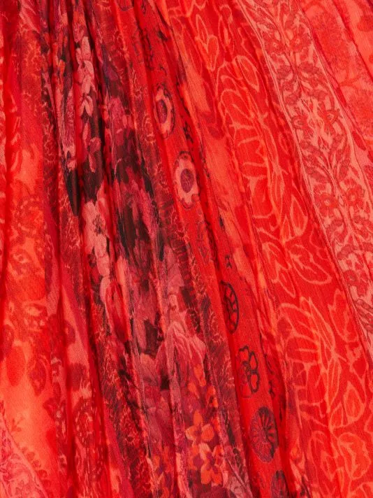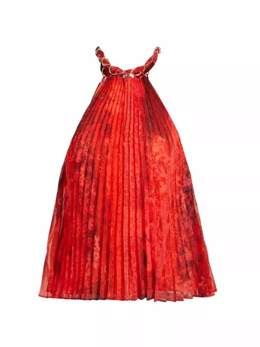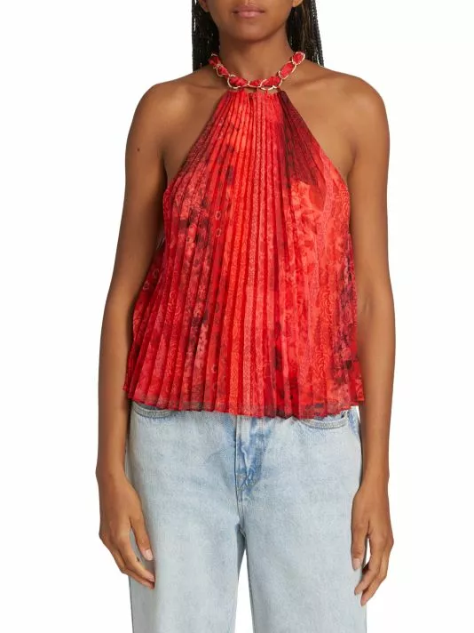 Alice + Olivia’s Alycia top is crafted of pleated chiffon with a muted print. This flowy piece is adorned with a chain-link detail at the neck.