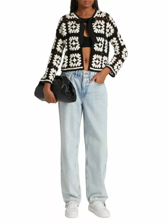 The Anderson cardigan from Alice + Olivia is crafted of crochet squares with a bow tie-front.