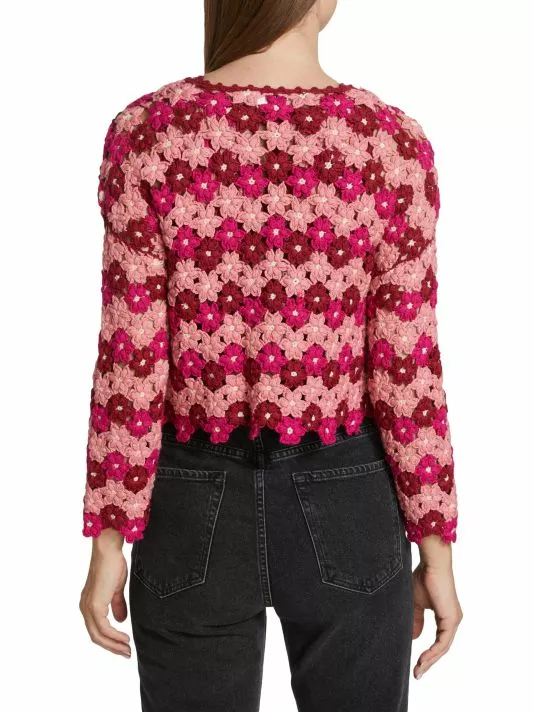 Crafted of crocheted cotton, Alice + Olivia’s Anderson crop cardigan features a floral pattern, long sleeves, and an open front.