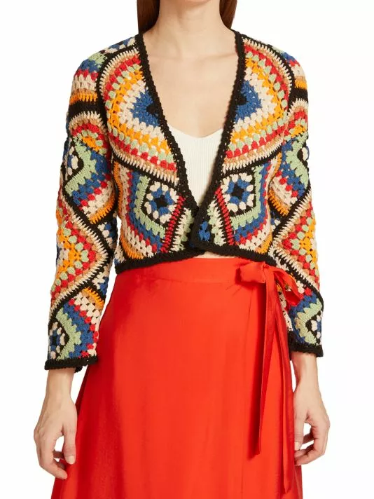 Cut in a boxy silhouette, this cropped crochet cardigan is complete with solid trim and a single front-button closure.