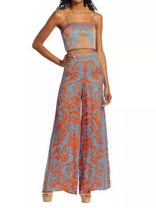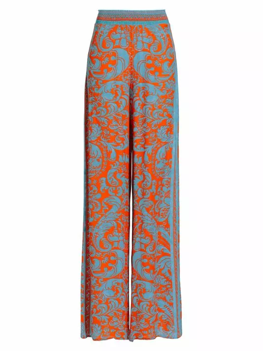 Cut in a wide-leg silhouette, these smocked pants boast a large abstract print.