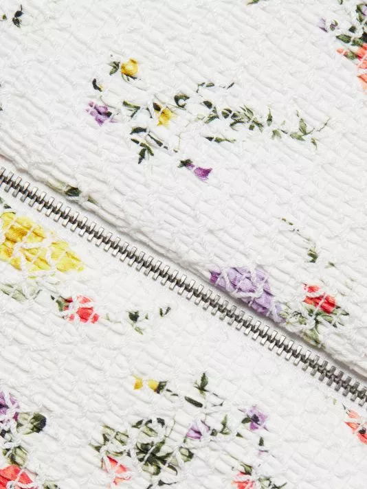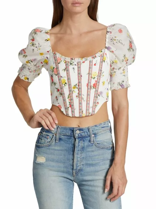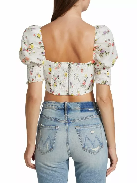 Alice + Olivia’s Audie corset top is adorned with a floral print and puff sleeves.
