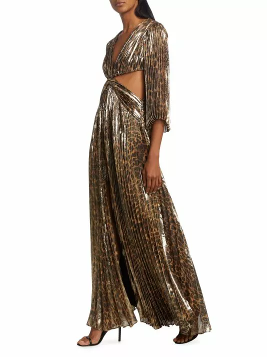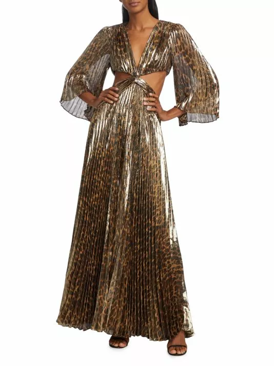 The Bahama maxi dress by Alice + Olivia is made of sparkling metallic fabric with a cutout waistline.