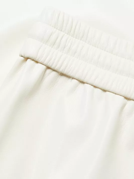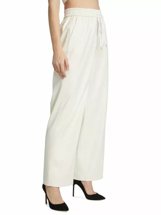 Alice + Olivia’s Benny pants are cut in a wide-leg silhouette. A vegan-leather front contrasts a crepe back, offering unique styling.