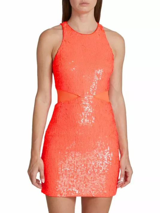 Decorated with sparkling sequins, Alice + Olivia’s Cara minidress is detailed with a round neck and mock cut-out waist with tonal paneling.