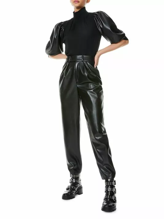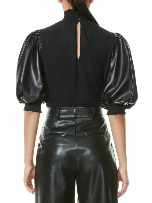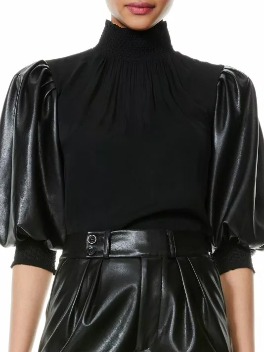 Billowy top adorned with faux leather puff-sleeves, trimmed with smocked detail.