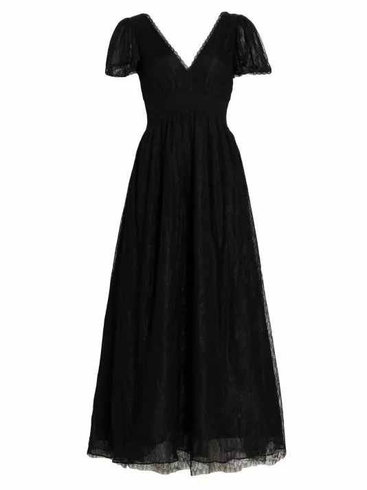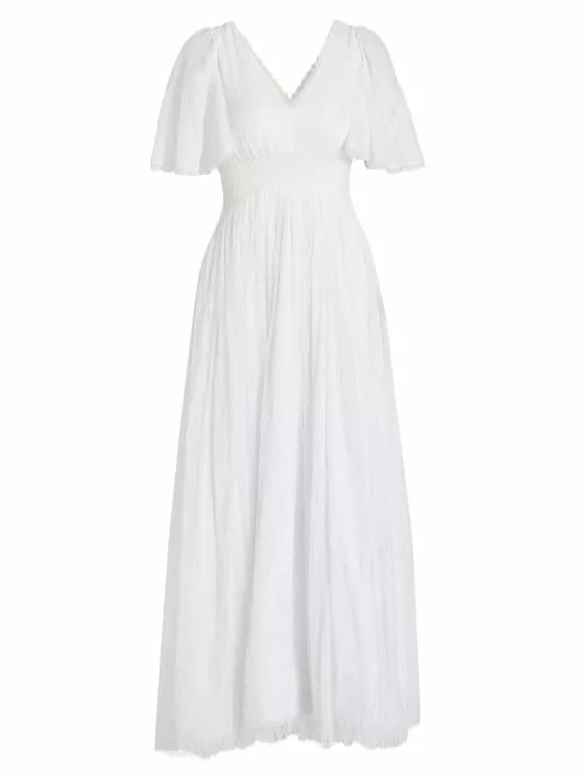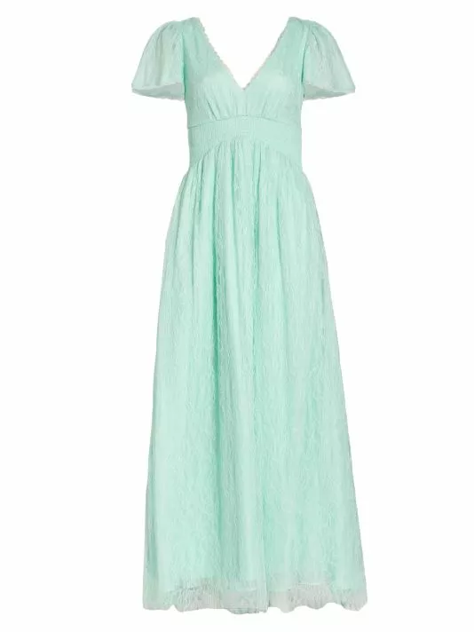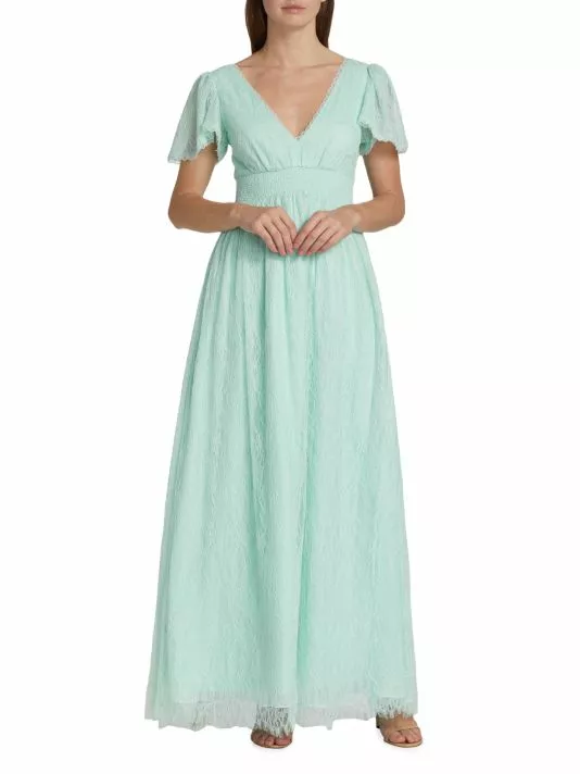 Alice + Olivia’s romantic Charlsie maxi dress flaunts a smocked waist, short flutter sleeves, and lace details.