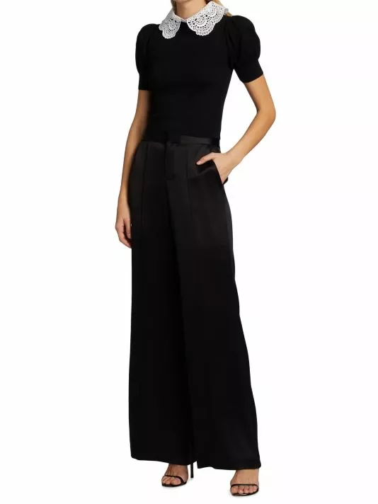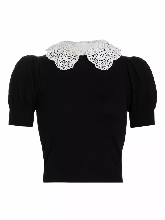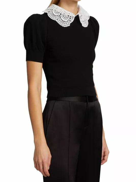 A removable eyelet collar tops this sweater top, designed with feminine puff sleeves.