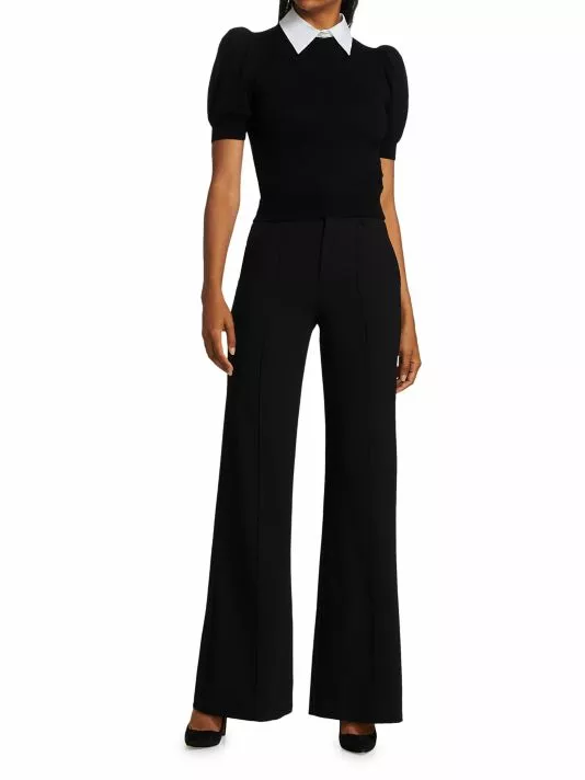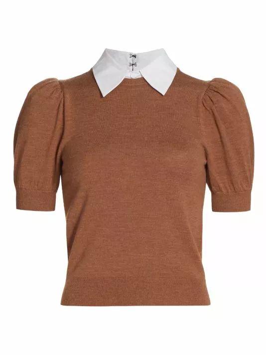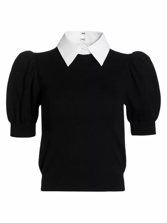 A chic contrasting Victorian neck is framed with feminine puff sleeves.