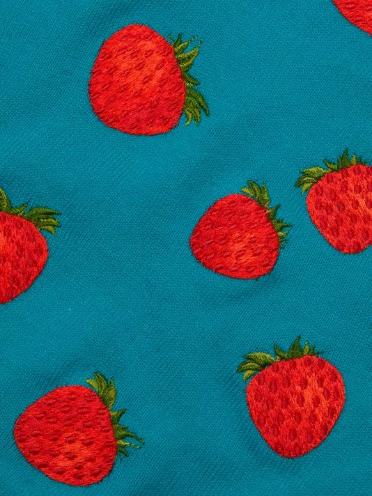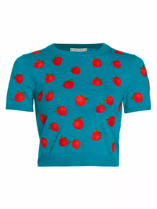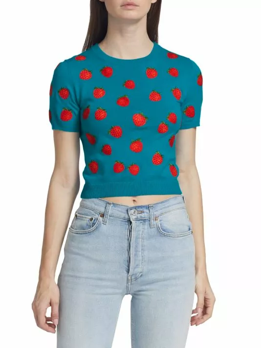 Alice + Olivia’s Ciara sweater is detailed with embroidery strawberries in a cropped fit.
