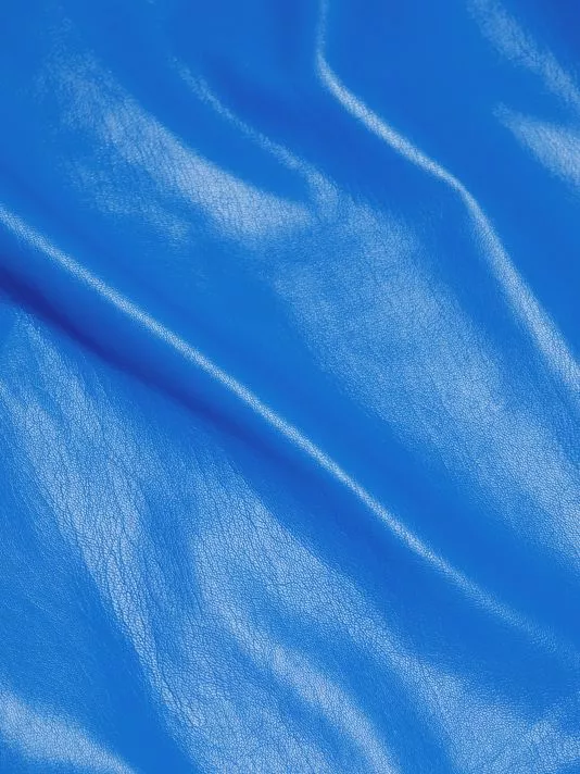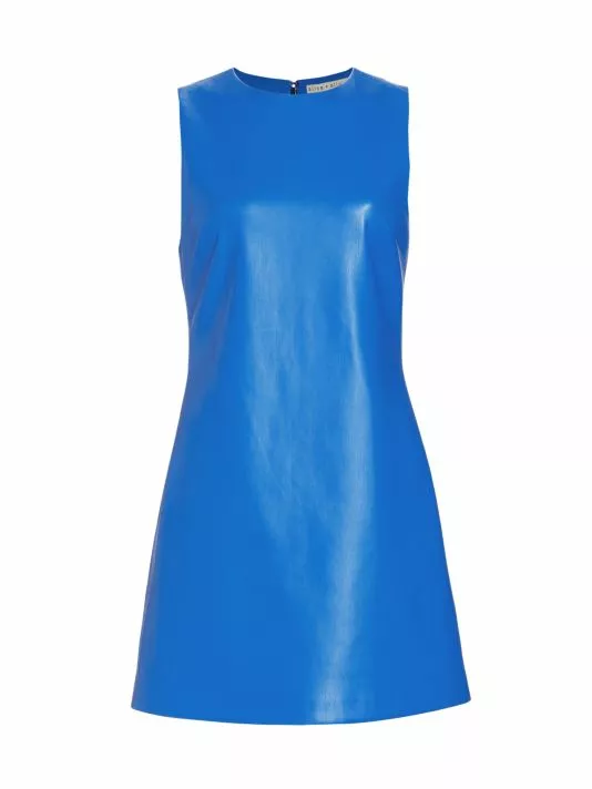 Crafted from glossy faux leather, this mini dress has a `60s-style A-line silhouette.