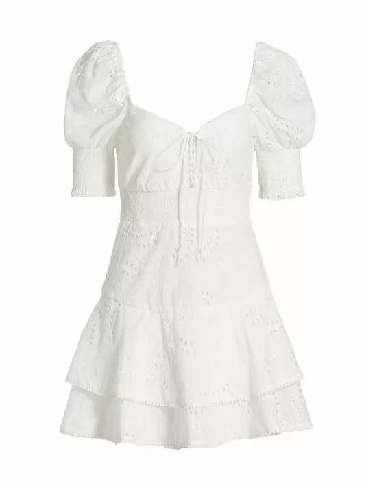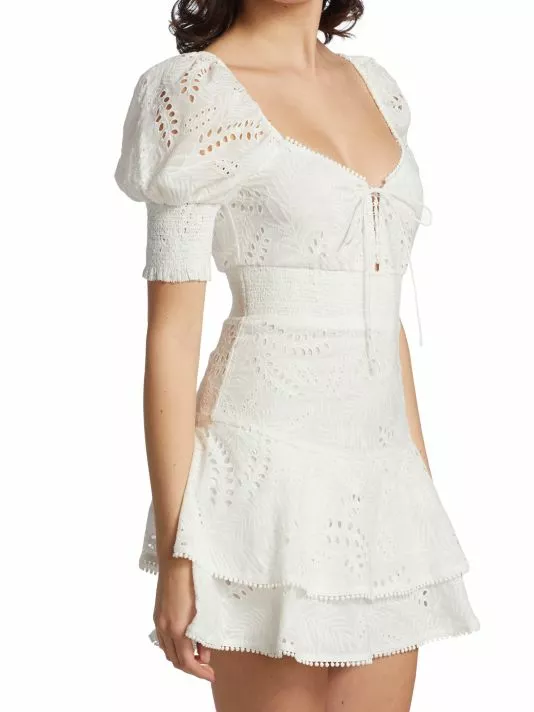 ONLY AT SAKS. Paisley eyelet adds charm to this pom-pom trimmed smocked mini dress.