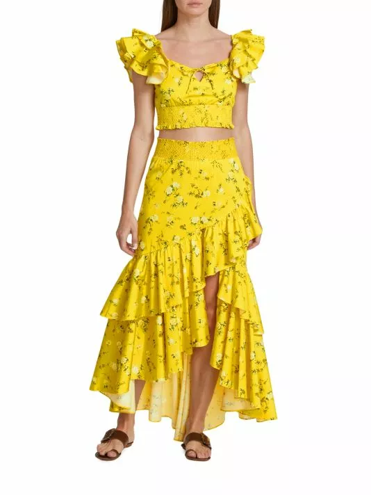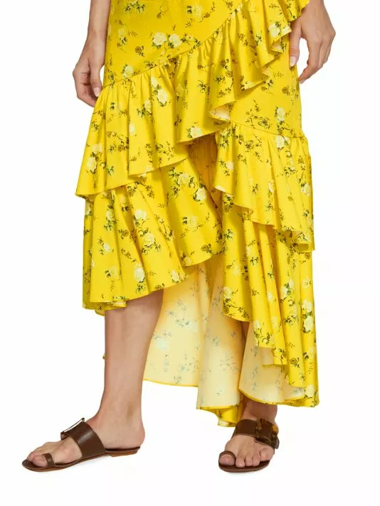 Crafted of a cotton blend, Alice + Olivia’s Cristina floral-print midi-skirt features a wrap-effect silhouette with a smocked waist and cascading ruffles.