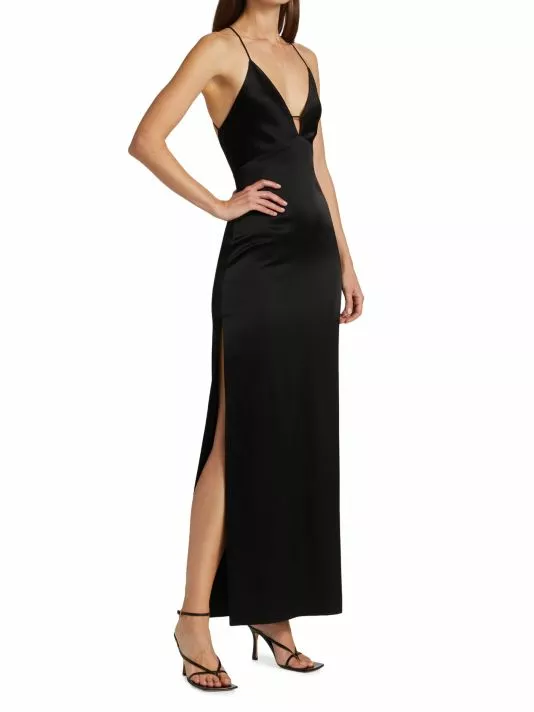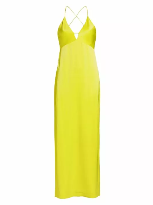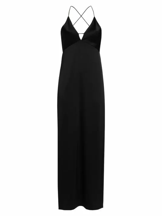 Satin maxi dress with sleek cross back featuring a long side slit and satin finish.