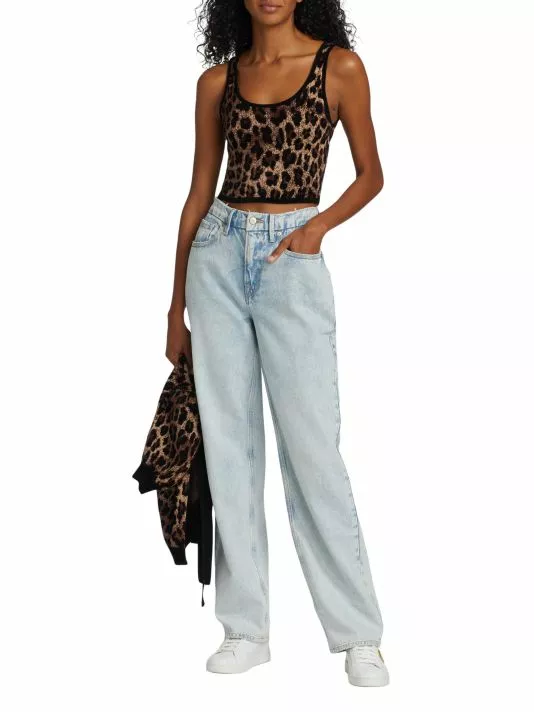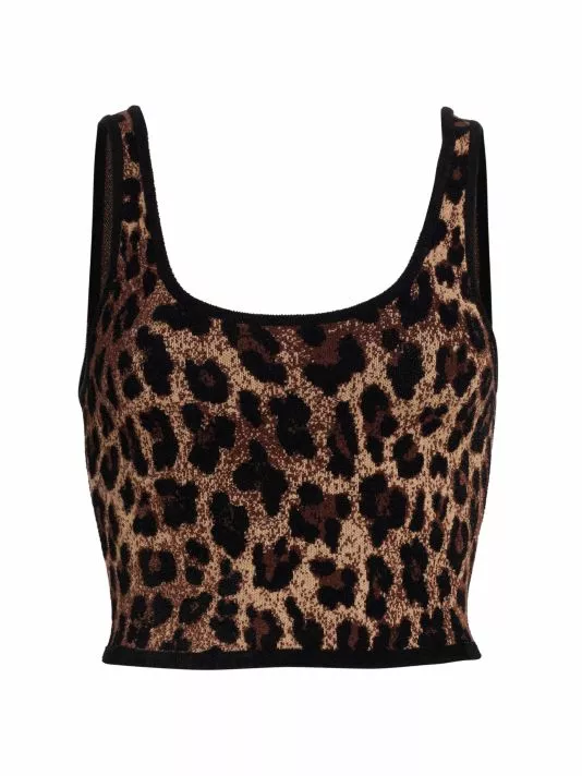Alice + Olivia’s Daryn cropped tank features a scoopneck and scoopback in a soft, leopard-print knit. Contrast trim finishes this effortless style.
