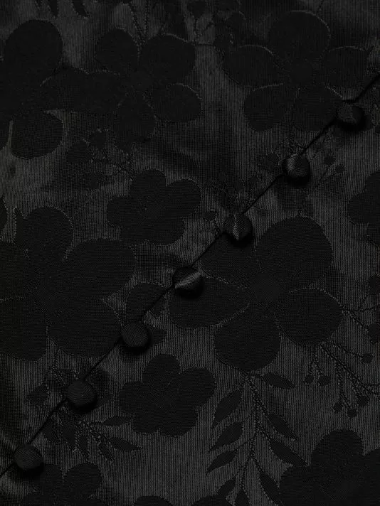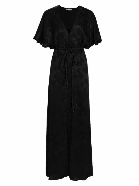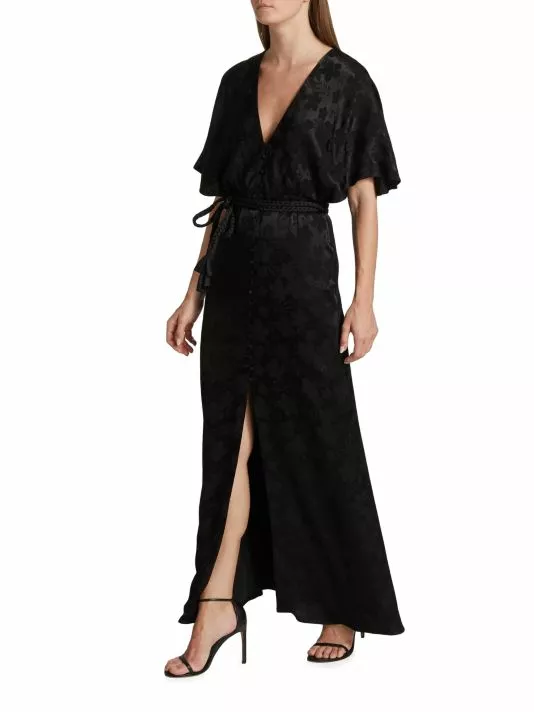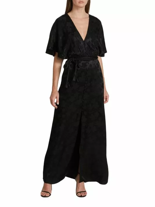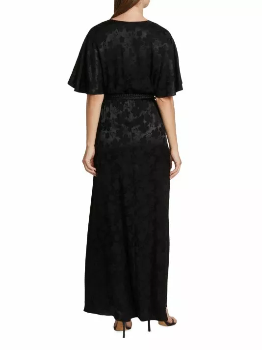 Alice + Olivia’s Davida maxi dress is crafted of satin jacquard, featuring a V-neck, flutter sleeves, and a braided wrap belt at the waist.