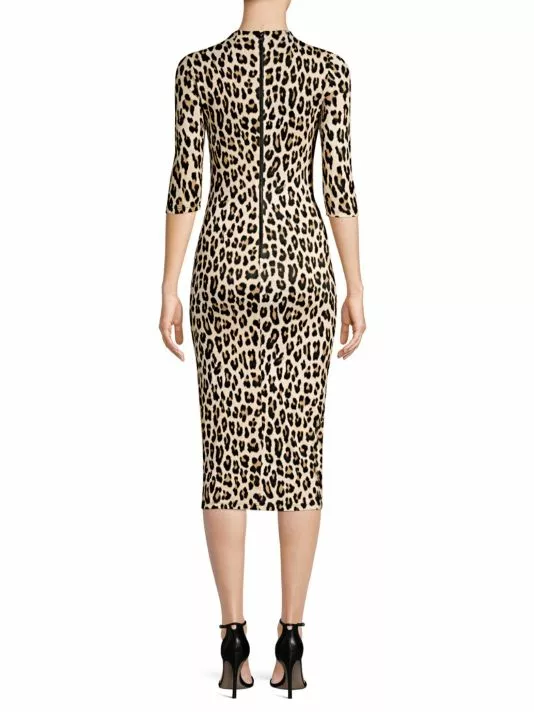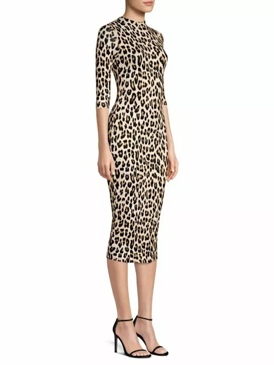 This form-fitting midi dress is enhanced with an allover leopard print.