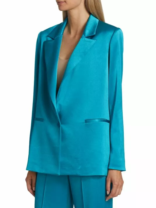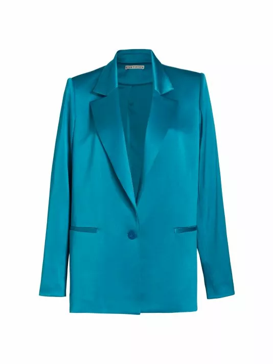 The Denny blazer by Alice + Olivia is crafted of satin in a single-breasted silhouette.