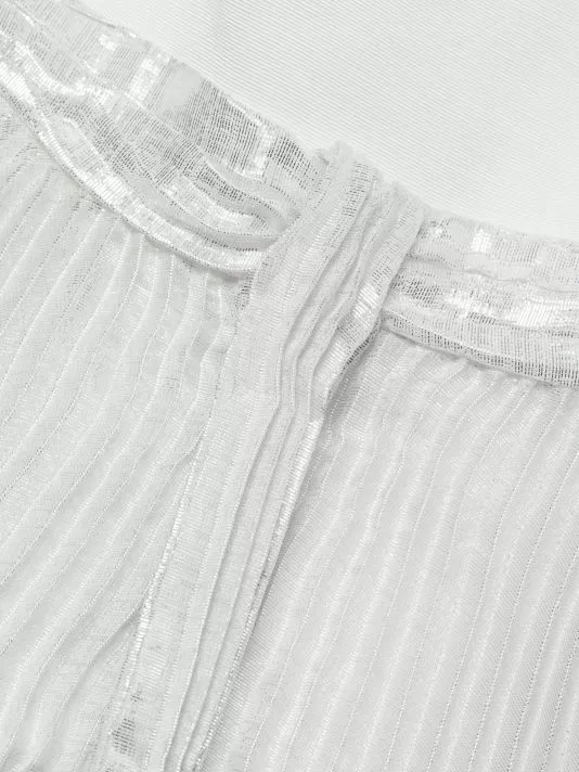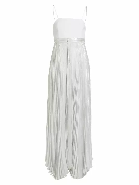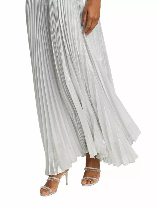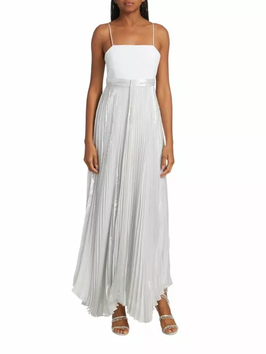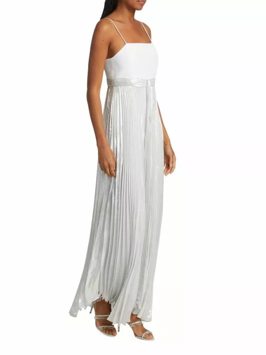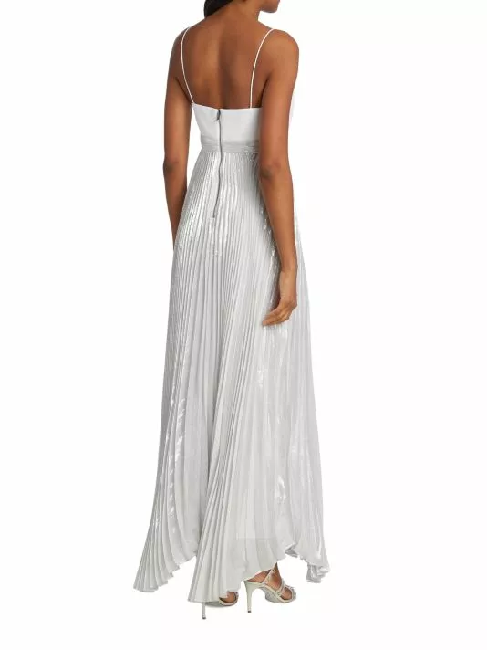 The Despina maxi dress from Alice + Olivia features a metallic pleated skirt with a flowing handkerchief hem. A fitted straight-neck bodice with delicate spaghetti straps completes the look.