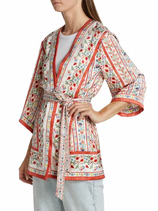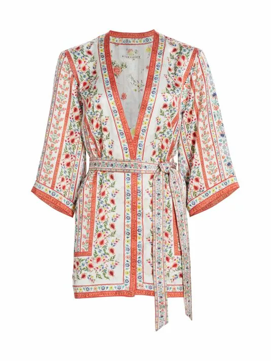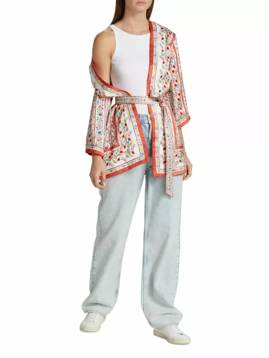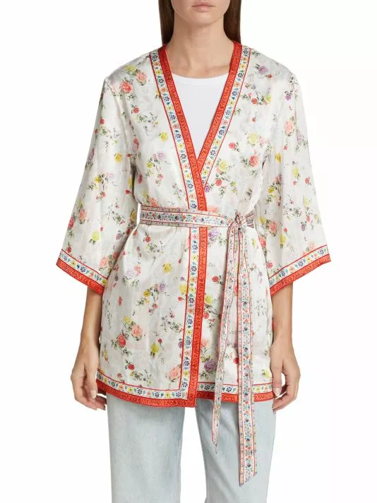 Crafted of satin, Alice + Olivia’s Domino kimono features a vibrant floral print.