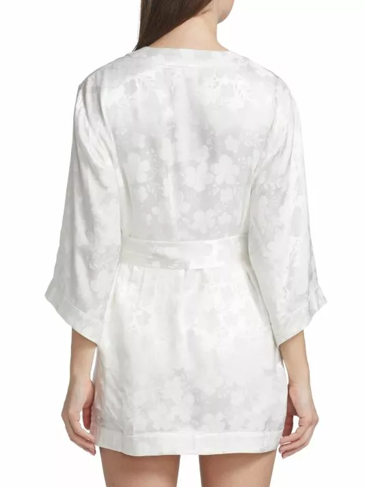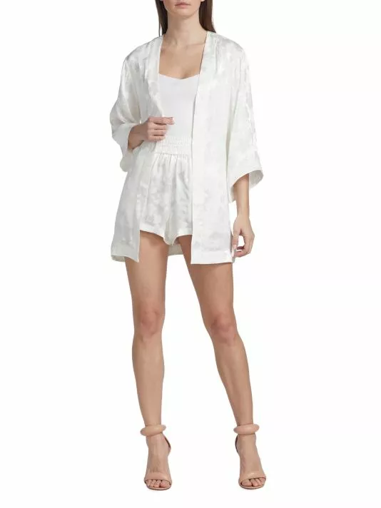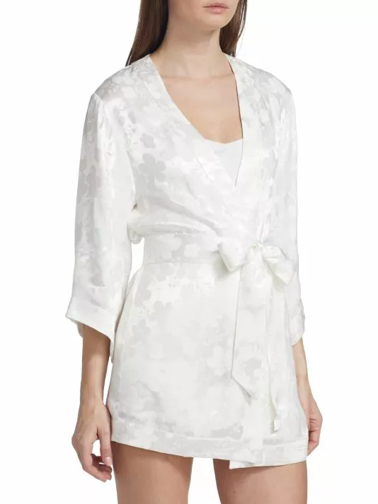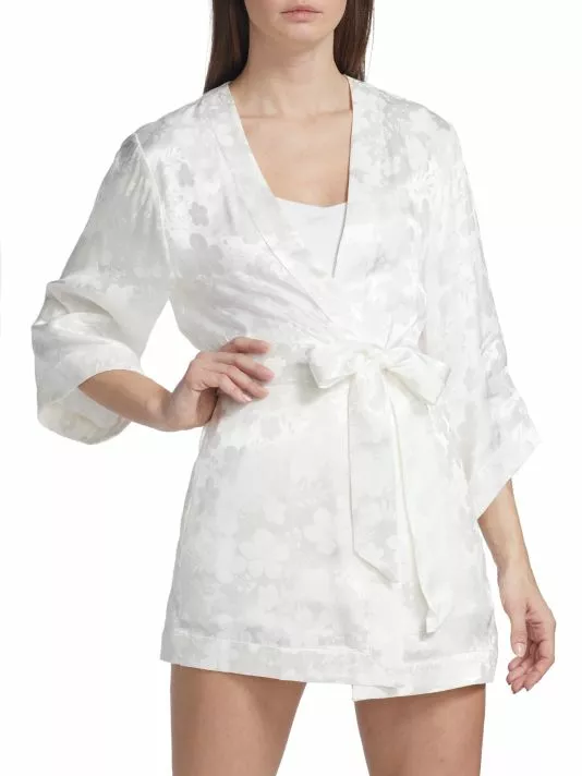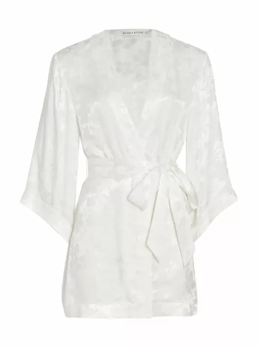 Made of floral textured satin, the Domino robe by Alice + Olivia is designed with breezy long sleeves.