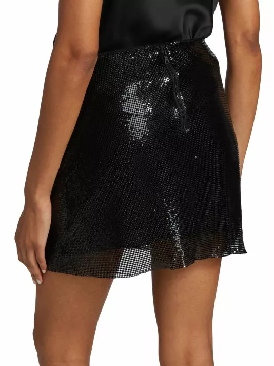 Cut in an A-line silhouette, Alice + Olivia’s semi-sheer aluminum Elana miniskirt is elevated by a lustrous chainmail construction.