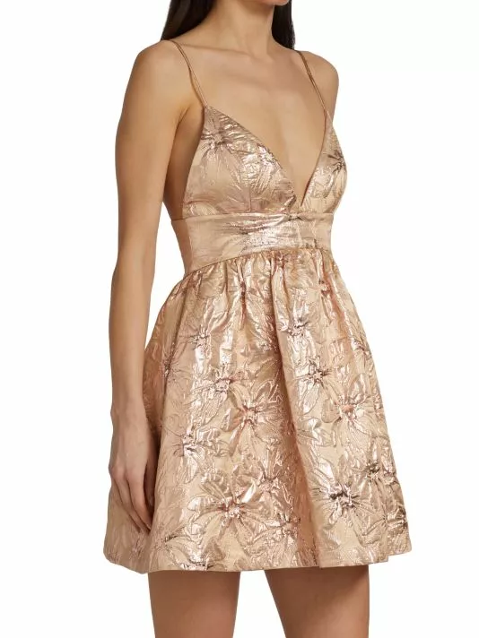 This billowy minidress sports a sharp V-neckline finished with a shiny floral brocade design, banded at the waist for added structure.