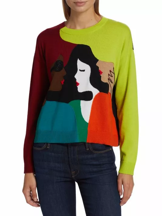 Alice + Olivia’s colorblocked Gleeson sweater is defined by bead-embellished graphics.