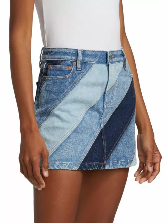 The Good high-waisted miniskirt from Alice + Olivia features a diagonal patchwork of multi-tone denim. Classic five-pocket styling finishes the look.