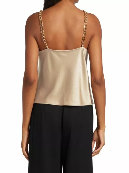 Made of high-shine satin, Alice + Olivia’s Harmon tank features a draped cowlneck. Goldtone chain straps add an edge to this classic style.