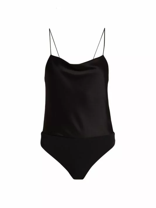 The Harmon bodysuit from Alice + Olivia features a satin bodice with a cowl neck and delicate spaghetti straps. This pull-on style is finished with a back zip closure.
