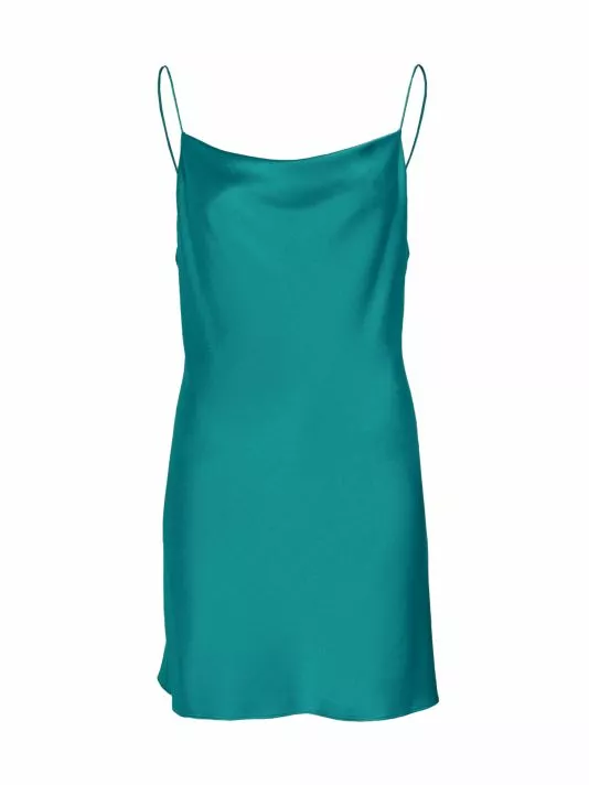 Alice + Olivia’s Harmony minidress is crafted of lustrous satin, featuring a slip silhouette with a draped cowl neck and spaghetti straps.