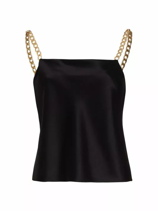 This tank top is made of draped satin with golden chainlink shoulder straps.