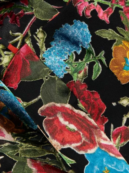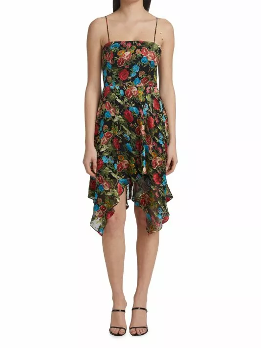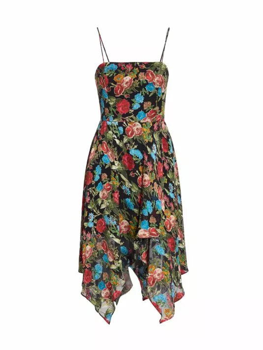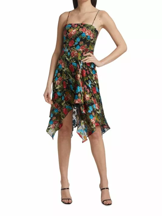 The Heather dress is made of floral fabric with an asymmetric handkerchief skirt.