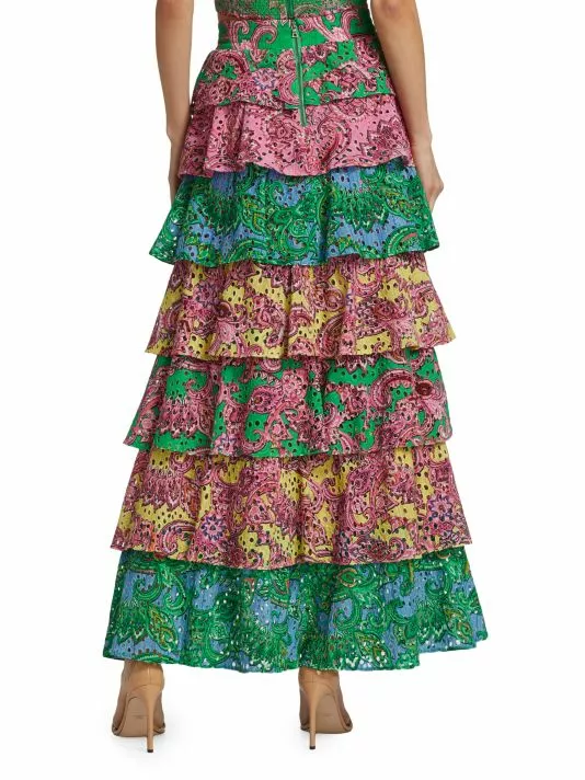 Designed with a bold look, this eyelet maxi skirt features tiered construction with vibrant paisley print.