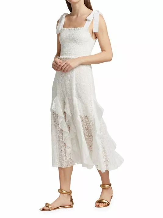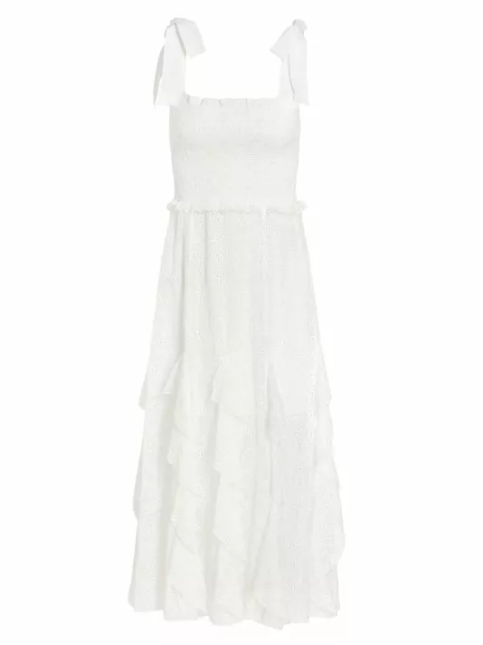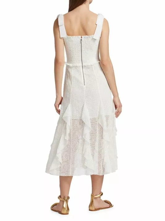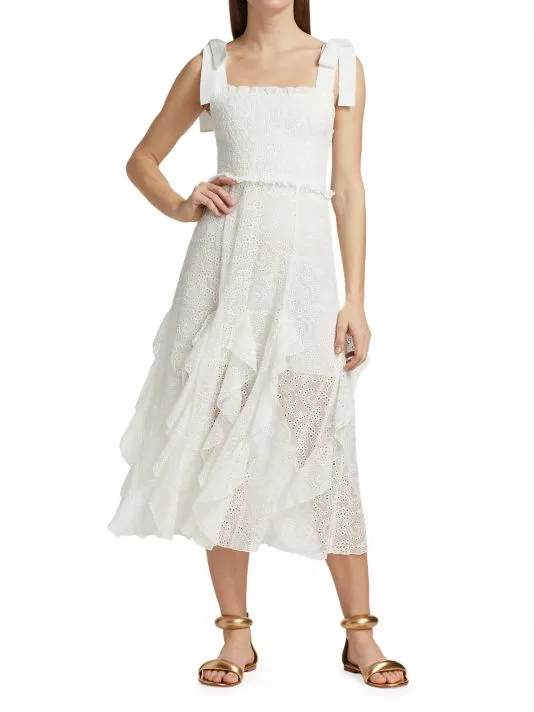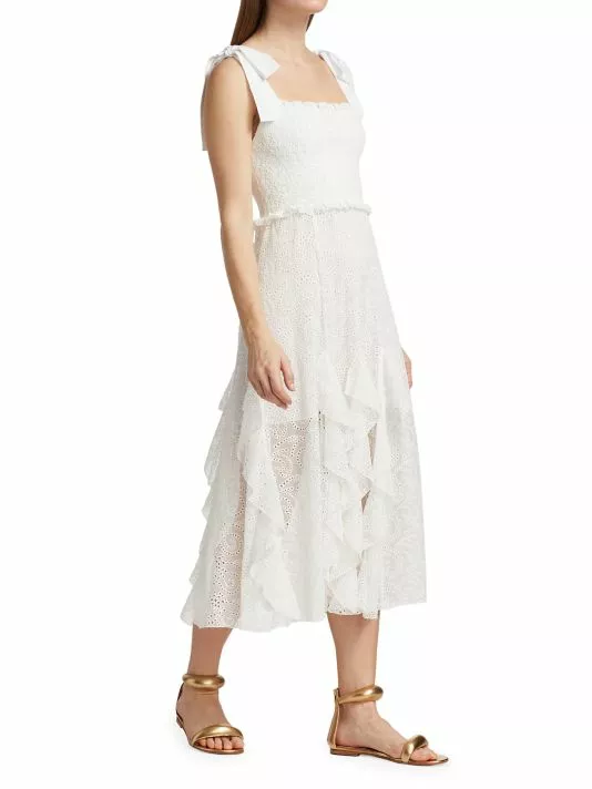 ONLY AT SAKS. Crafted of soft cotton, this midi-length dress is detailed with a smocked bodice and eyelet embroidery throughout the design.