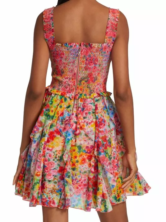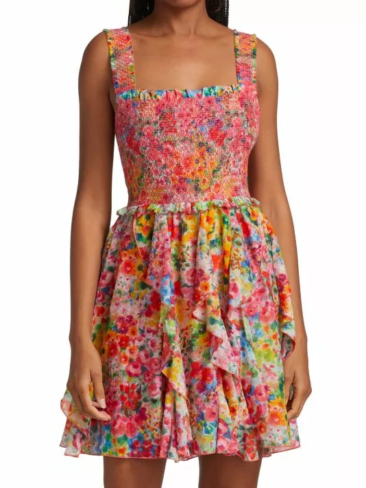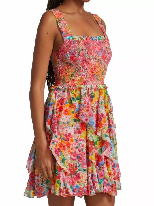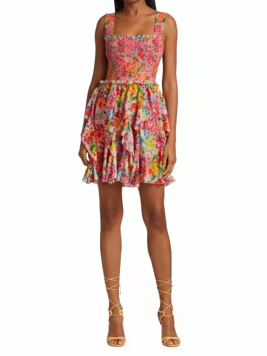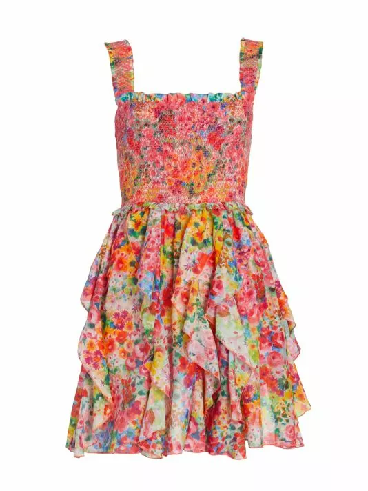 Boasting a colorful floral print, Alice + Olivia’s Jocelyn minidress features a smocked square-neck bodice with ruffled trim. An A-line skirt with flowing vertical ruffles completes this bright style.
