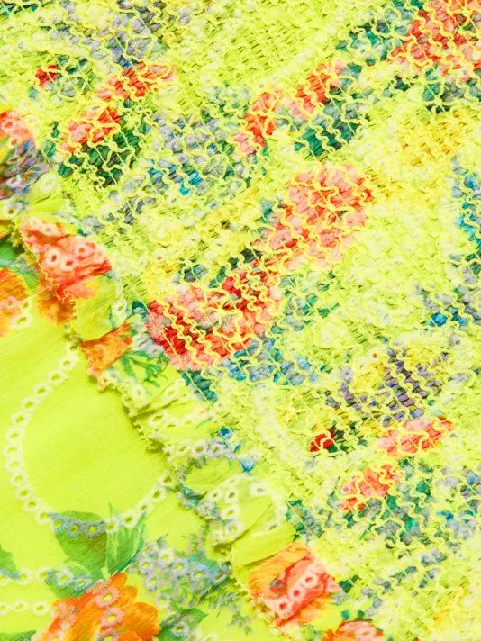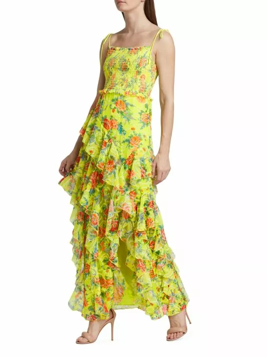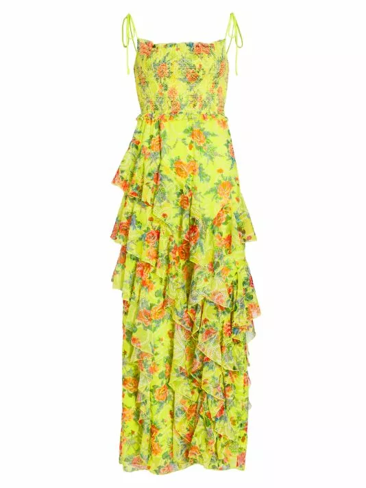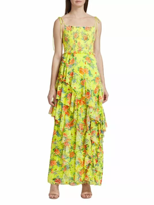 Alice + Olivia’s Jocelyn dress is styled with ankle-length asymmetric tiered layers with ruffled edges, a smocked bodice, and eyelet embroidered detailing.