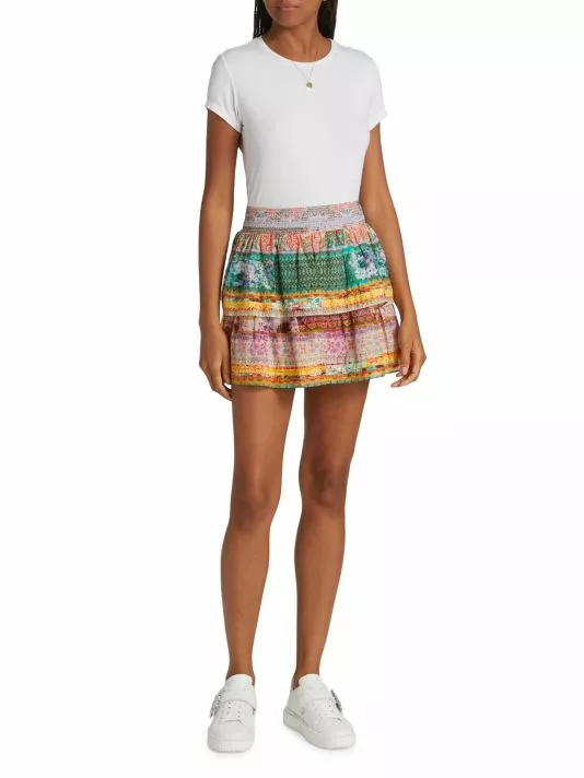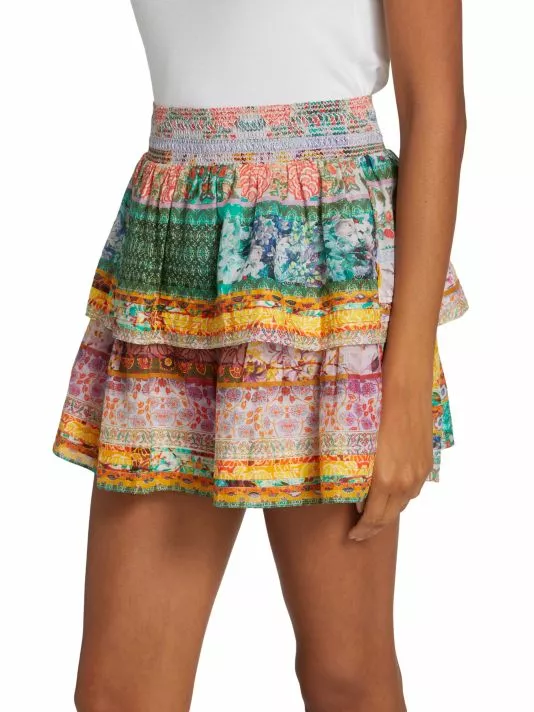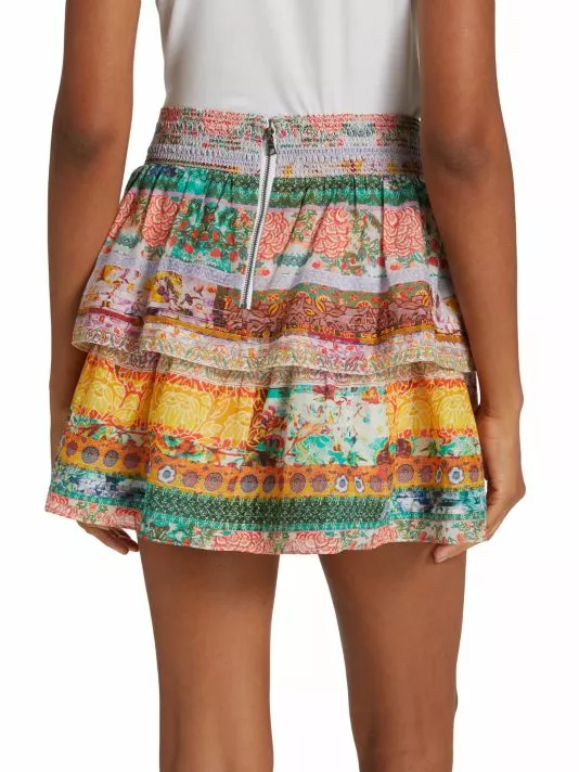 The Jojo miniskirt from Alice + Olivia is crafted of printed cotton with two ruffle tiers and a high-smocked waistband.