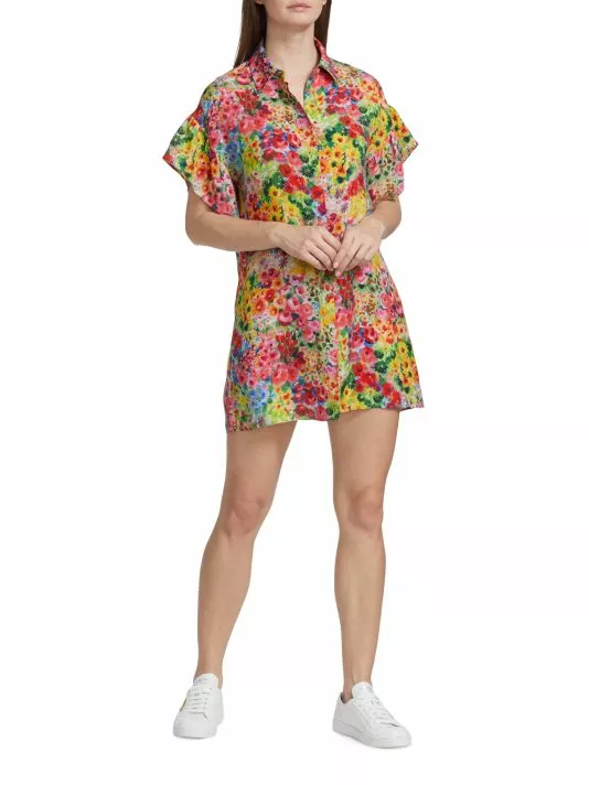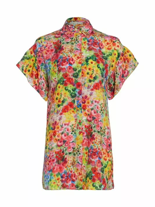 Alice + Olivia’s Jude shirtdress showcases a vibrant painterly floral print and is styled with flutter sleeves, a spread collar, and a relaxed shift silhouette.