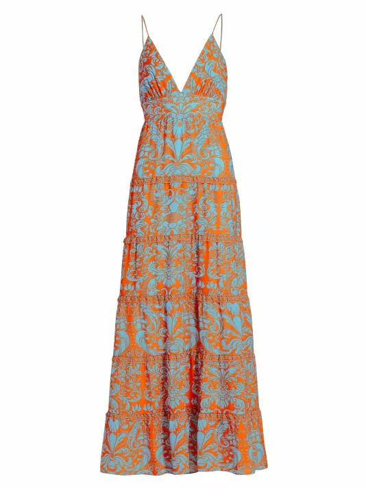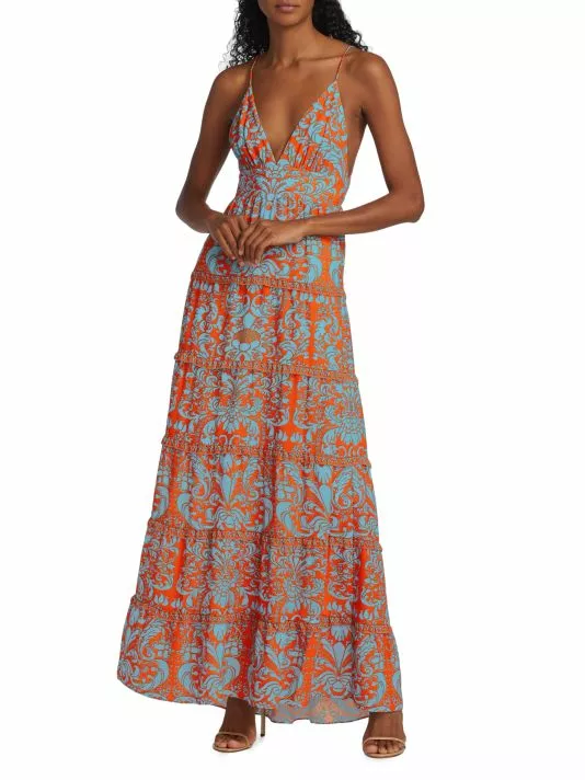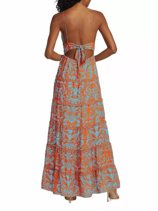 Enhanced with a flattering plunge V-neck, Alice + Olivia’s Karolina maxi dress is detailed with a cutout back featuring a knotted tie. This below-the-knee piece is finished with a voluminous tiered skirt for effortless movement.