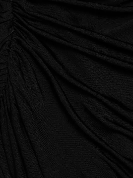 Alice + Olivia’s Katey minidress features a draped bodice with an asymmetric hem. This fitted style is complete with a deep cowlneck and delicate spaghetti straps.