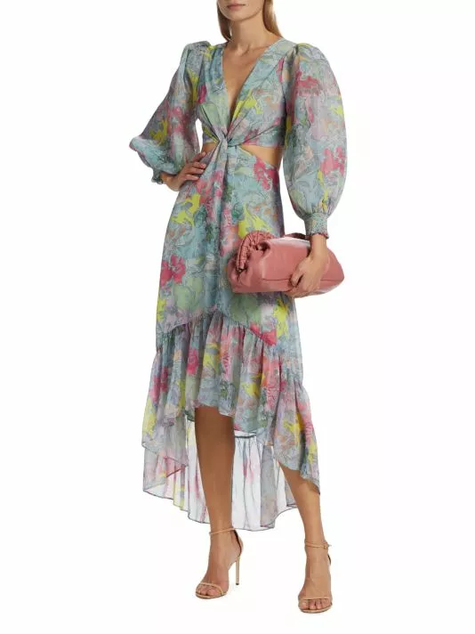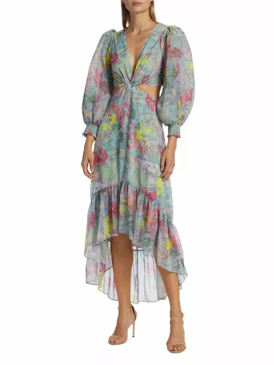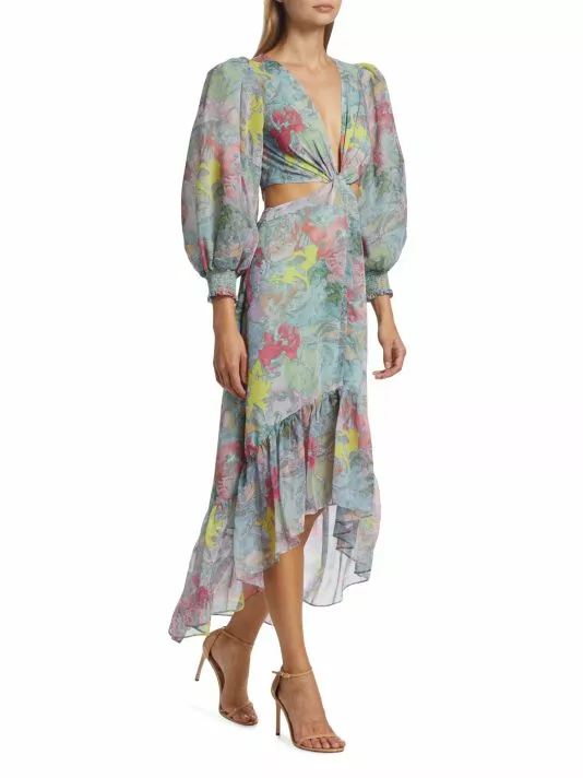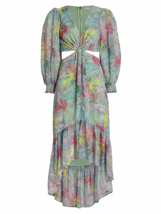 Alice + Olivia’s Katia midi-dress is adorned with a multicolored abstract print. Designed with a high-low hem, this alluring piece is complete with a plunging V-neckline, cut outs at the waist, and dramatic puff sleeves.