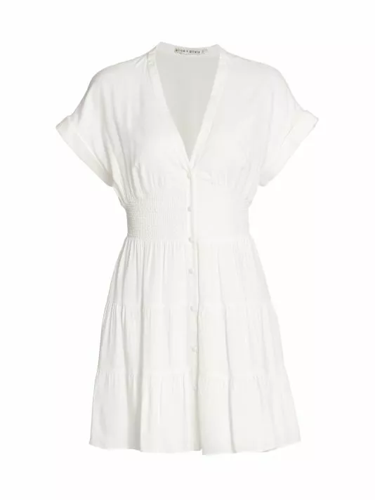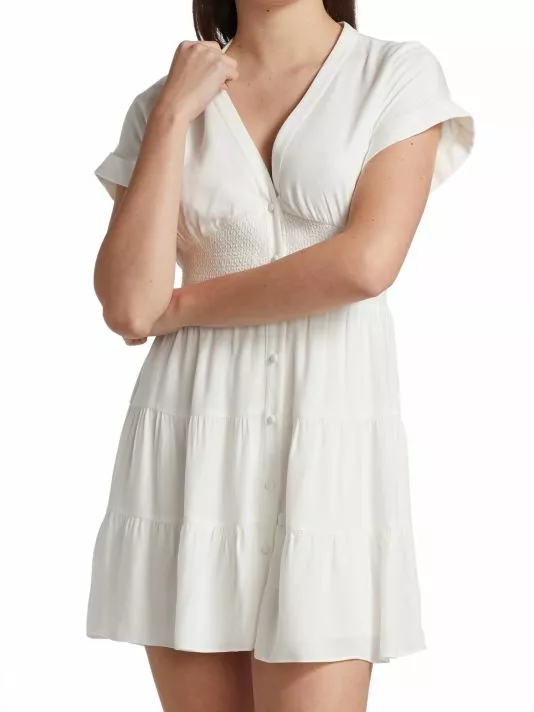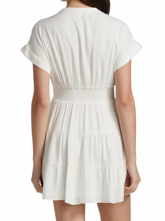 Breezy minidress with cuffed sleeves, featuring a smocked empire waist and shirred details.