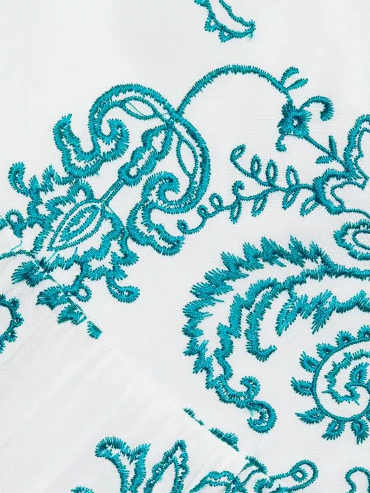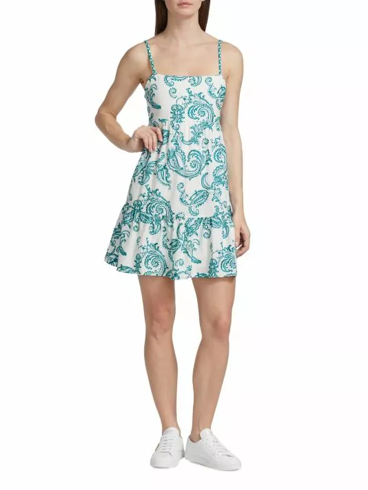 Alice + Olivia’s Khira dress features paisley embroidery with a tiered silhouette and a tie back.