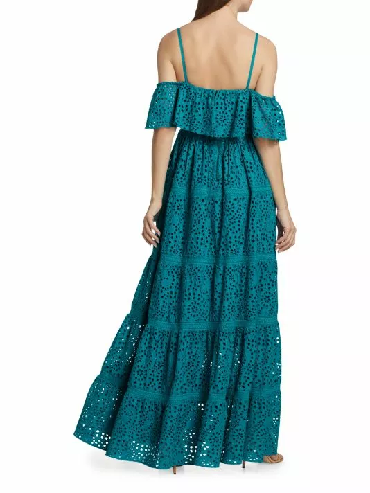 This charming off-the-shoulder maxi dress is accented with an eyelet finish, adorned with a playful flounce at the neckline.