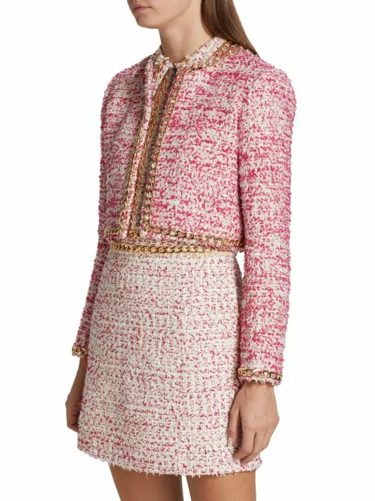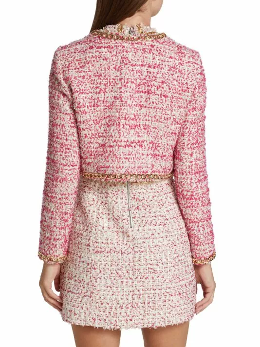 Alice + Olivia’s Kidman cropped tweed jacket features a round neck and an open front. Goldtone chain trim elevates this classic silhouette.