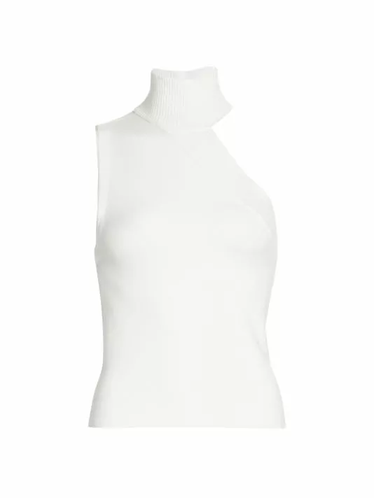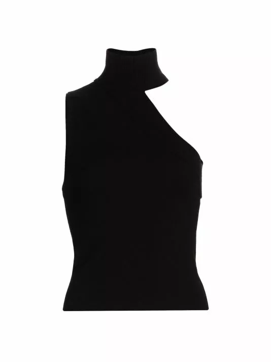Ribbed trim tops this asymmetrical top with cutout design in soft stretch knit.